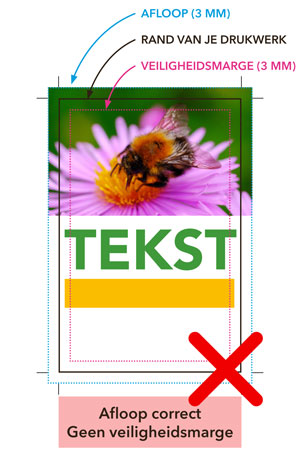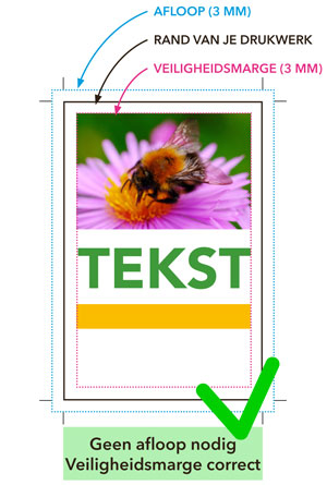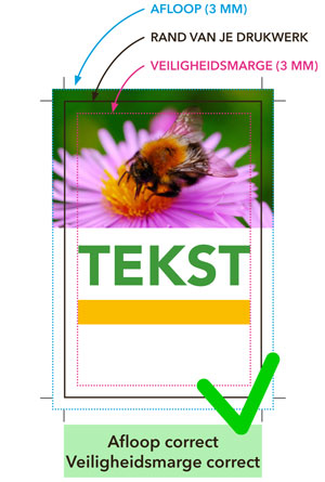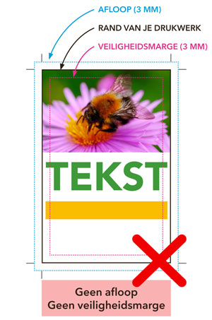 Om goed te kunnen snijden hebben wij een document nodig dat bedoeld is voor drukwerk, met 3 mm afloop. Maak beeldelementen die tot aan de rand van het papier komen 3 mm groter dan het bestandsformaat. Afloop is nodig omdat je bij het snijden van drukwerk een kleine marge nodig hebt. Alleen dan kan je drukwerk echt strak gesneden worden. Om dezelfde reden adviseren wij om tekst minimaal 3 mm binnen de rand te plaatsen. Dat is de 3 mm veiligheidsmarge. Heeft je ontwerp geen elementen die in de buurt van de rand komen? Dan hoef je geen afloop aan te leveren.