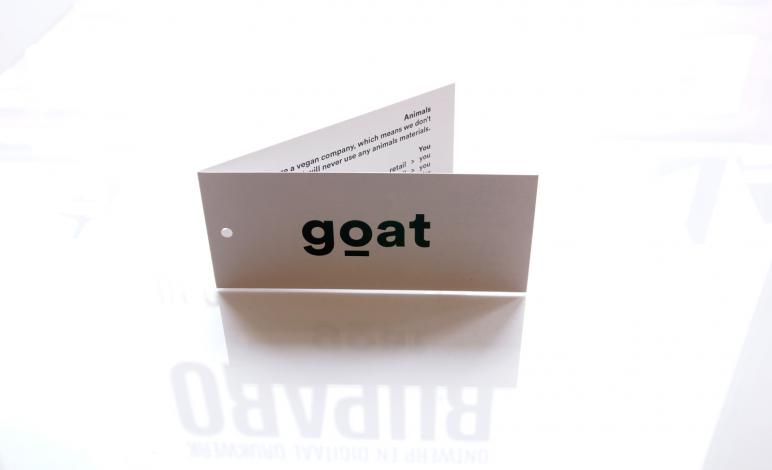 Hangtags voor het bedrijf Goat, gedrukt op Cocoon Uncoated vervolgens is het gerild, gevouwen en voorzien van een boorgat.